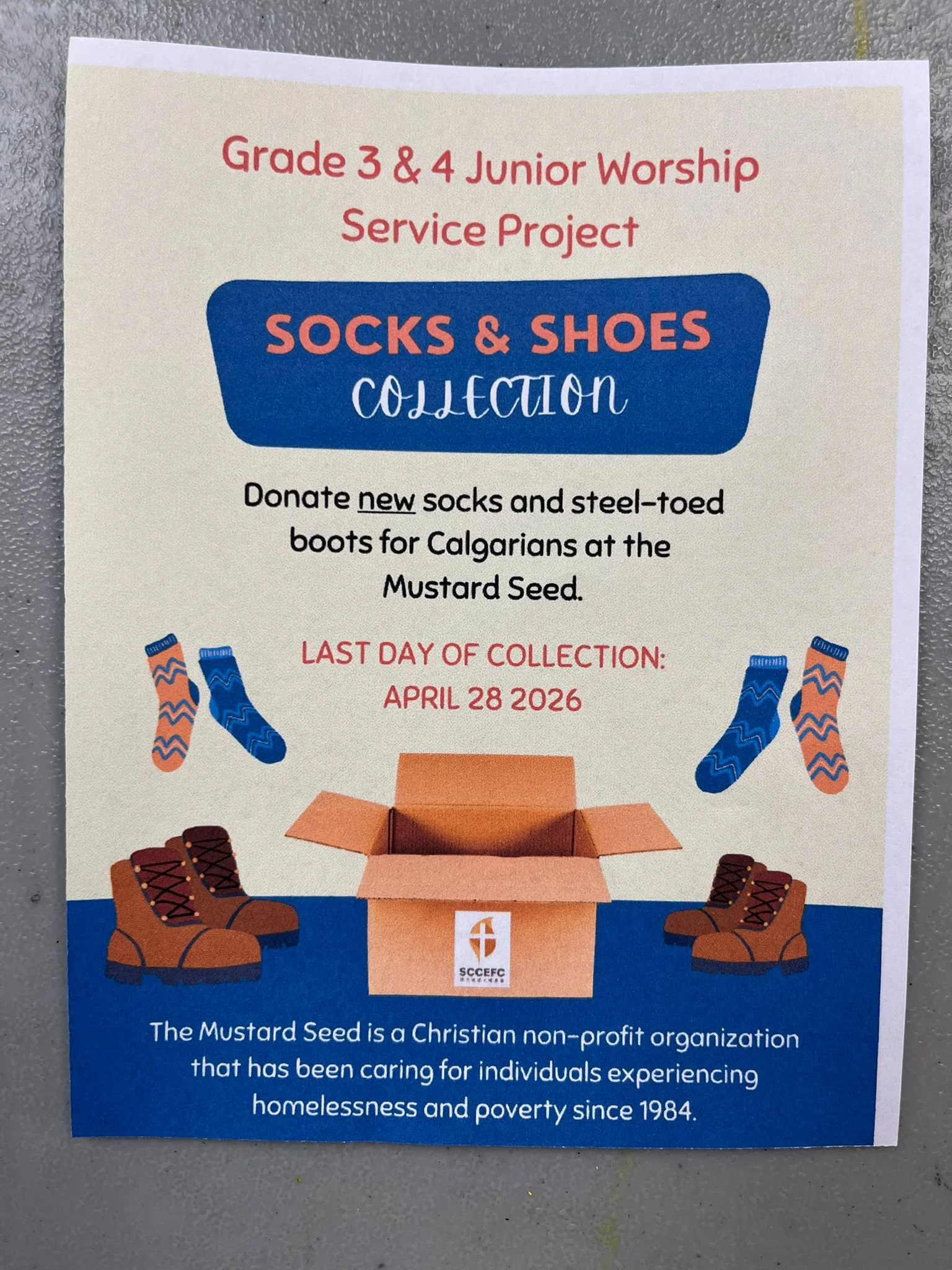 We’re collecting NEW steel-toed boots and socks (mens sizes 9–11) in our foyer collection bins until April 28.